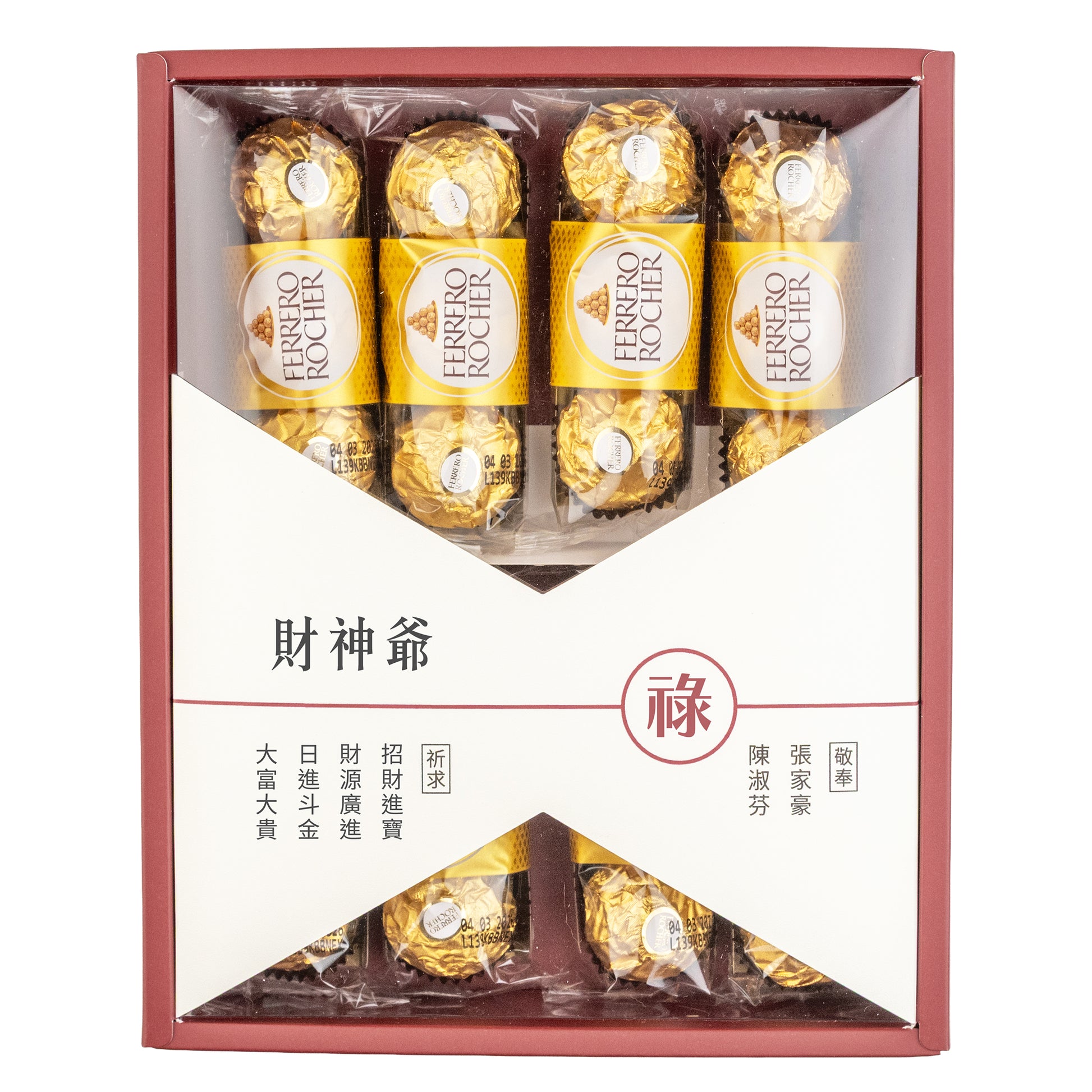 敬財神,從細節展現誠意。此款禮盒可客製腰封,一次呈現四組心願、福祿壽符號與敬奉者姓名或公司名,神前一目了然。