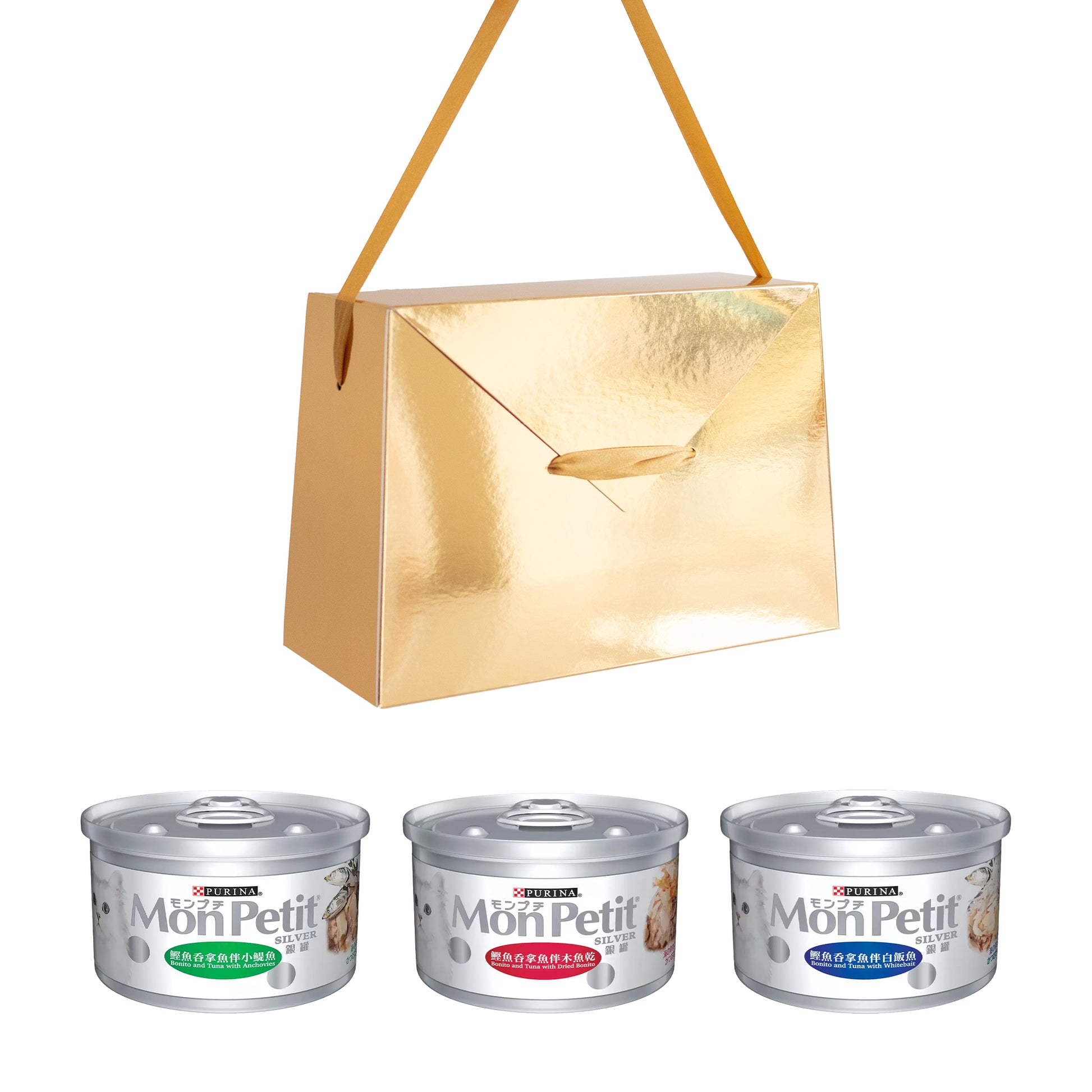 貓倍麗熱銷日本品牌,嚴選素材,上等鮮肉、鮮魚製成的罐罐。三種口味各四:鰹魚鮪魚伴銀魚口味、鰹魚鮪魚煨柴魚口味、鰹魚鮪魚小鯷魚拼盤口味。
