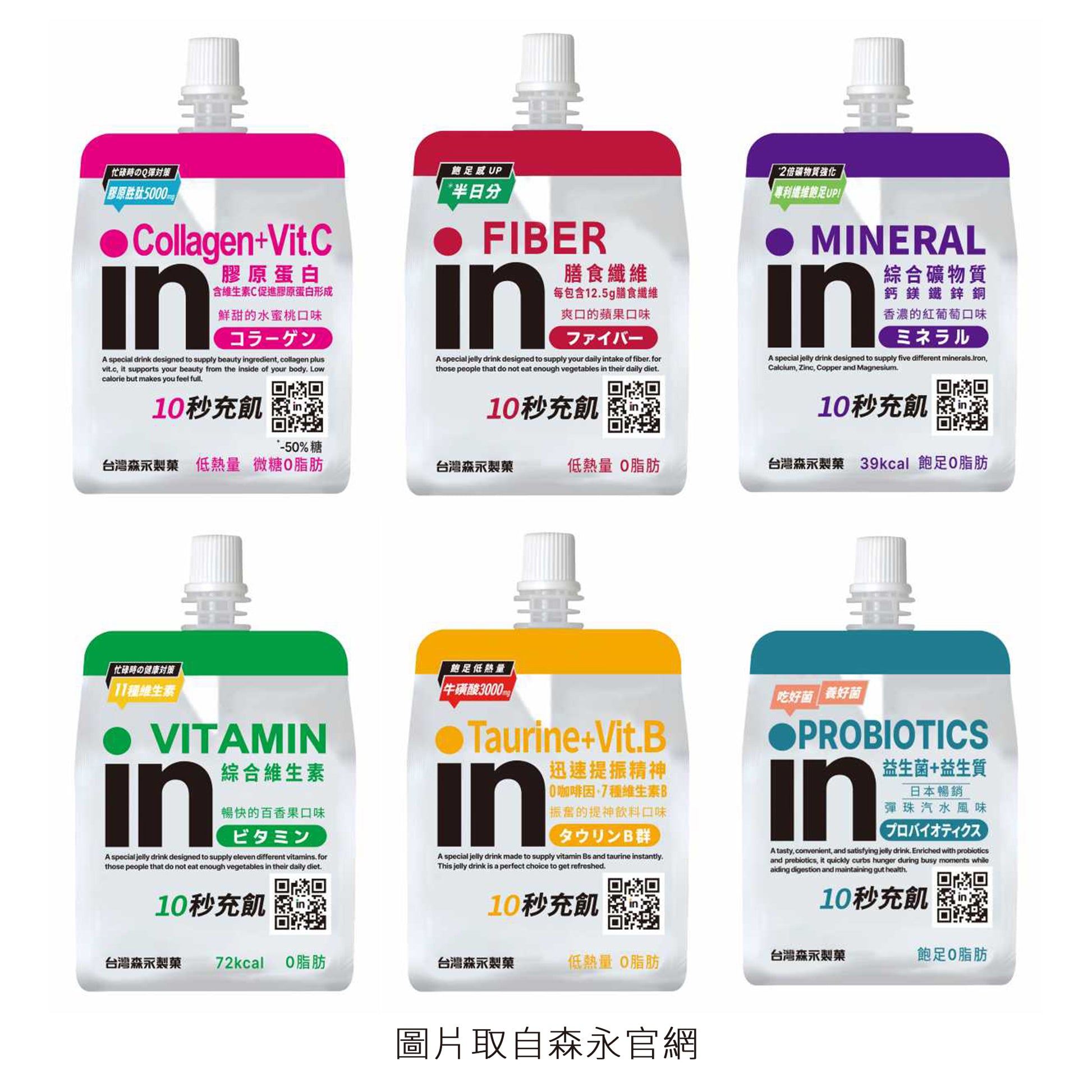 6種機能(口味)各1入:膳食纖維(蘋果)、益生菌(彈珠汽水)、牛磺酸+B群(提神)、綜合礦物質(紅葡萄)、維他命(百香果)、膠原蛋白(水蜜桃)。