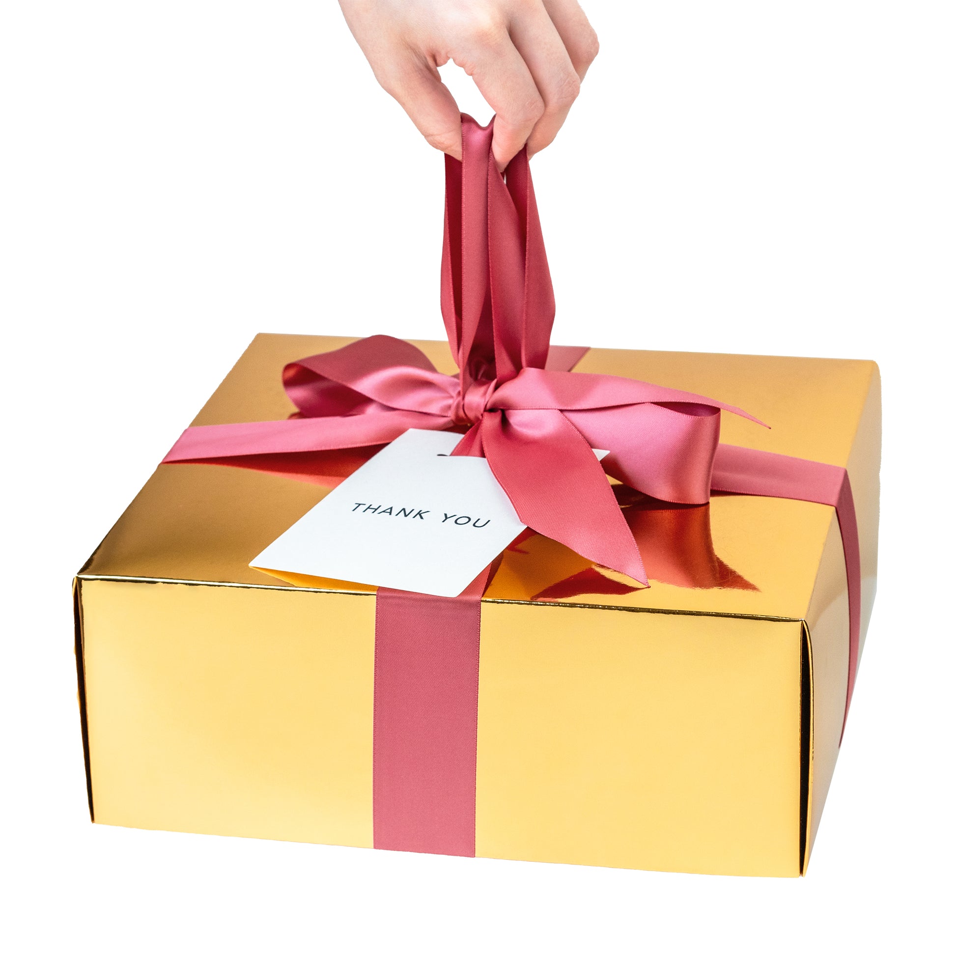 仿金箔裱厚卡,緞帶綁雙蝴蝶結作為提把,兼顧環保與質感,不另附提袋。