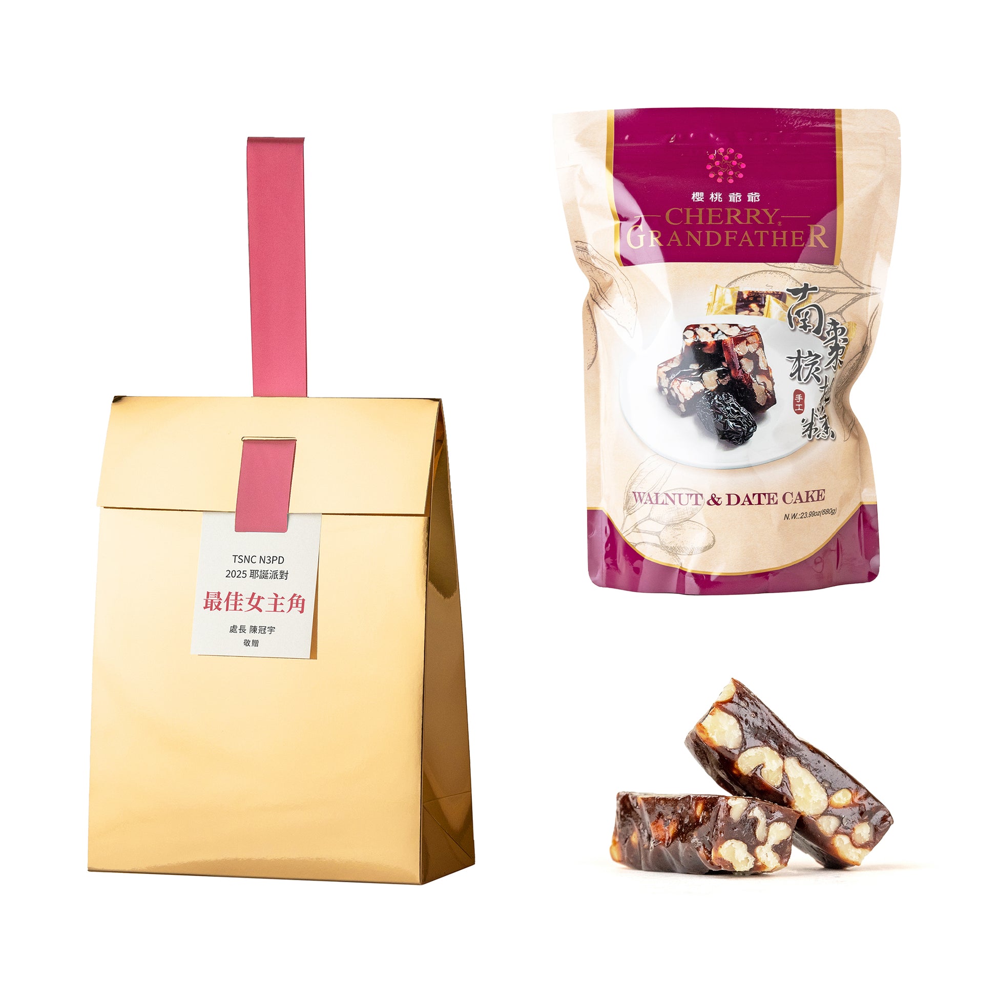 南棗核桃糕搭配金獎禮袋,優雅不失份量;緞帶掛小卡,獎項、名次、公司與收贈者姓名一次客製。一件就做,最適合敬老祝壽、師長致謝、企業表揚與拜訪客戶,拿在手上就像頒了座專屬小金盃。也能用於升遷榮退、團隊達標與生日祝福,讓名字成為全場焦點。