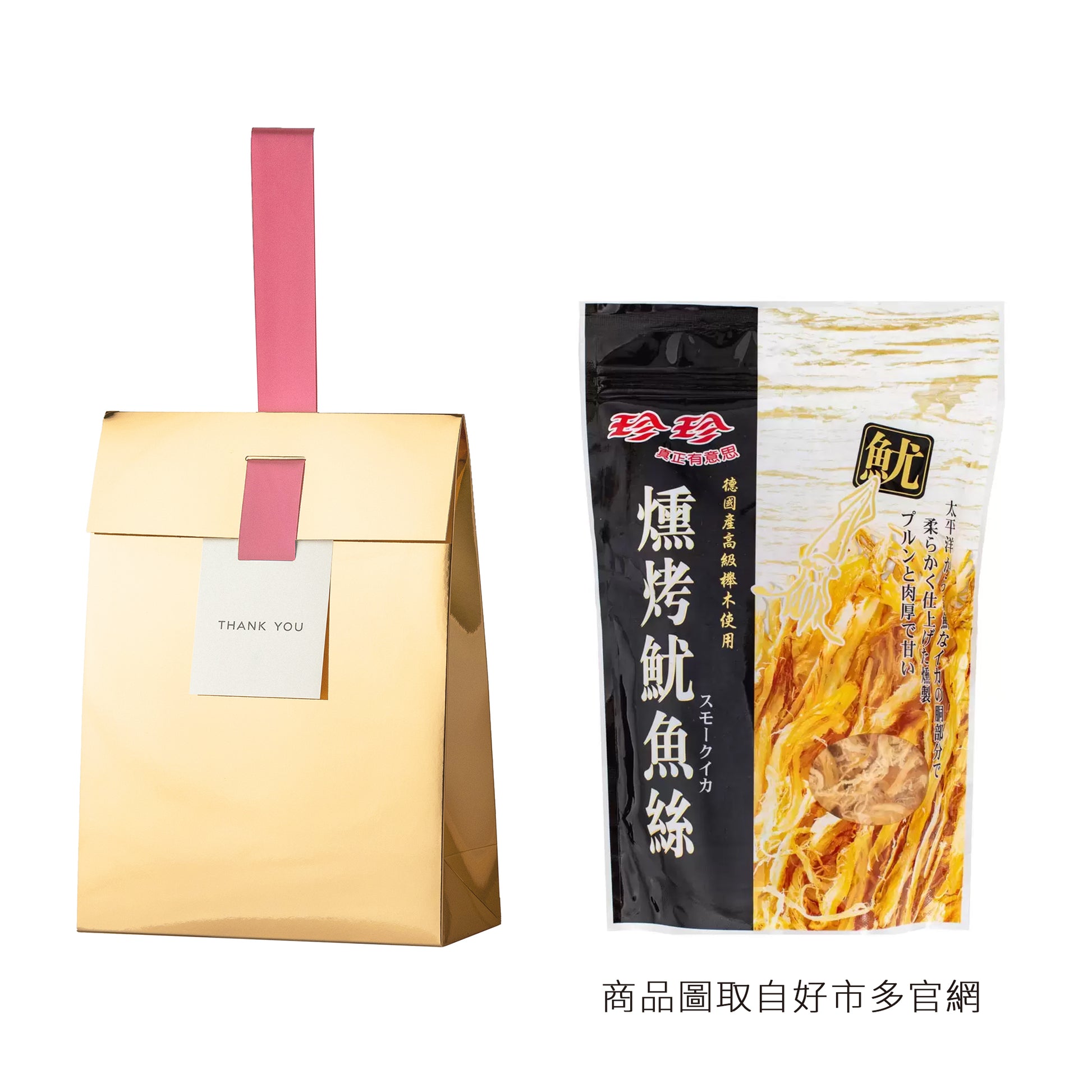 把榮耀寫上名字才算到位。金獎禮袋把米色小卡穿過緞帶,一件也能客製獎項與收受禮姓名;打開就是珍珍燻烤魷魚絲,煙燻鹹香超下酒,聚餐頒獎、尾牙活動、專案慶功或球聚分享。