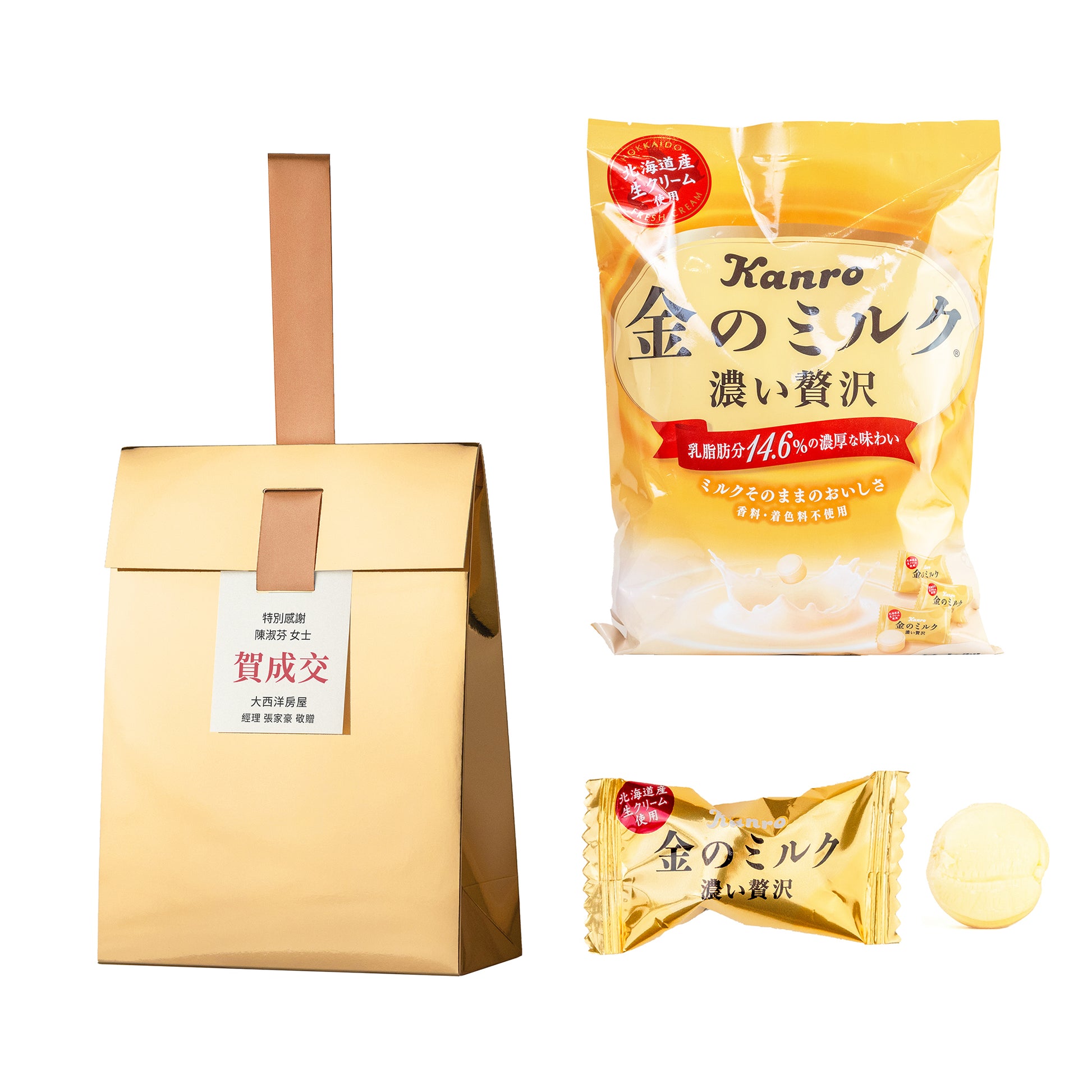 濃醇奶香的金牛奶硬糖裝進金獎禮袋,緞帶上掛一張為你專印的小卡:獎項、名次、公司、送禮與得獎姓名都能寫。一件也客製,剛剛好的儀式感,用於部門表揚、教師節或客戶致意都好看,迎新送舊、讀書會小獎、考前加油也合宜。