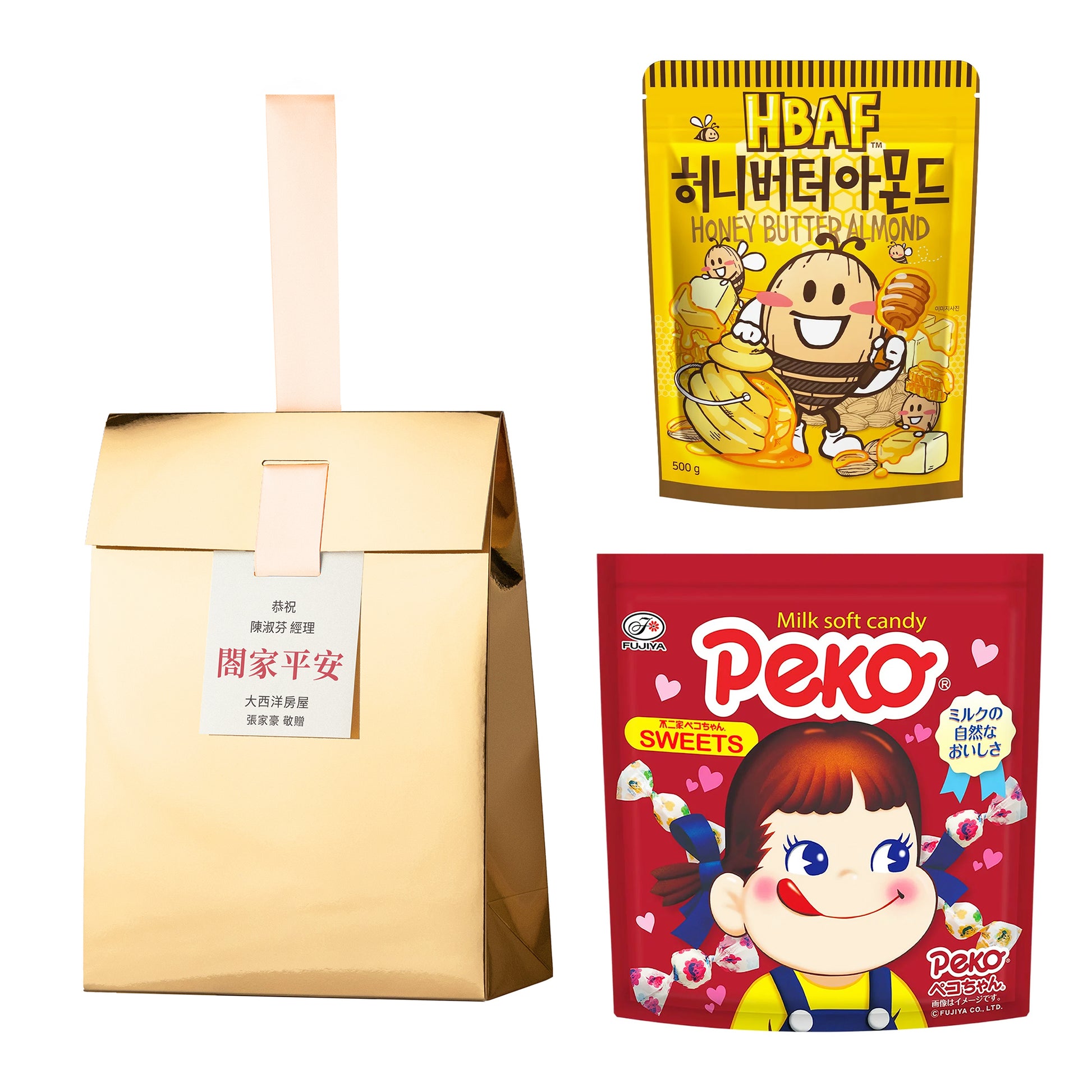 日本傳奇不二家經典牛奶糖,520g 超大包裝,濃郁的北海道奶香是童年最美好的回憶;搭配韓國必買 HBAF 蜂蜜奶油杏仁果,同樣 500g 豪邁份量,蜂蜜與奶油交織出的酥脆口感,讓人一吃就上癮。