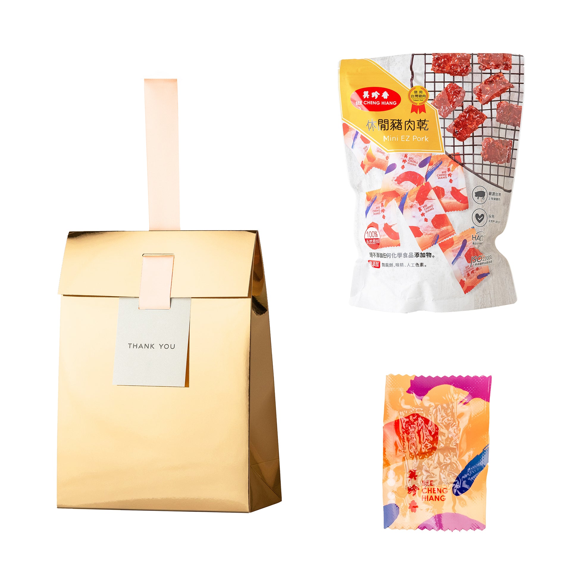 金色禮袋綁上緞帶,一件就能客製你的獎項與姓名;把美珍香豬肉乾變成一份有面子的金獎。特別適合部門小型頒獎、尾牙業績王、最佳新人、專案里程碑與生日感謝。把送禮與收禮人的名字都寫上,榮耀一目了然,也很適合派對活動獎項或升遷祝賀。