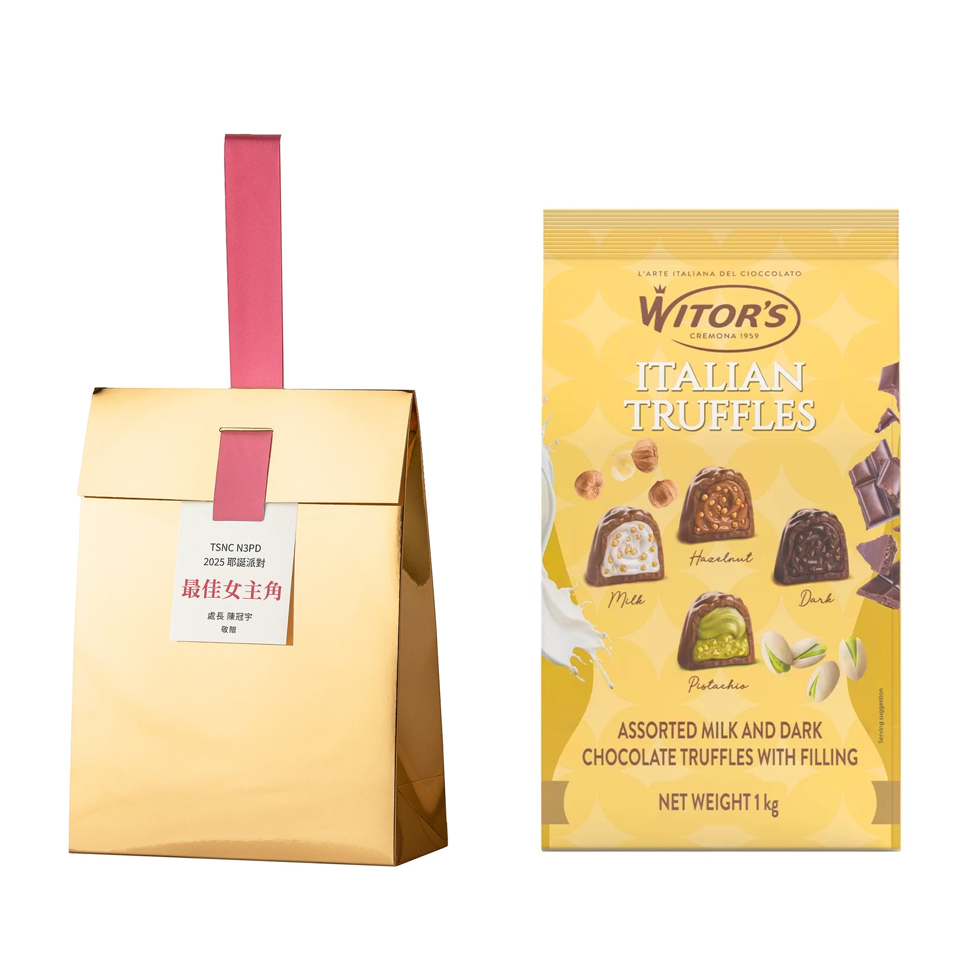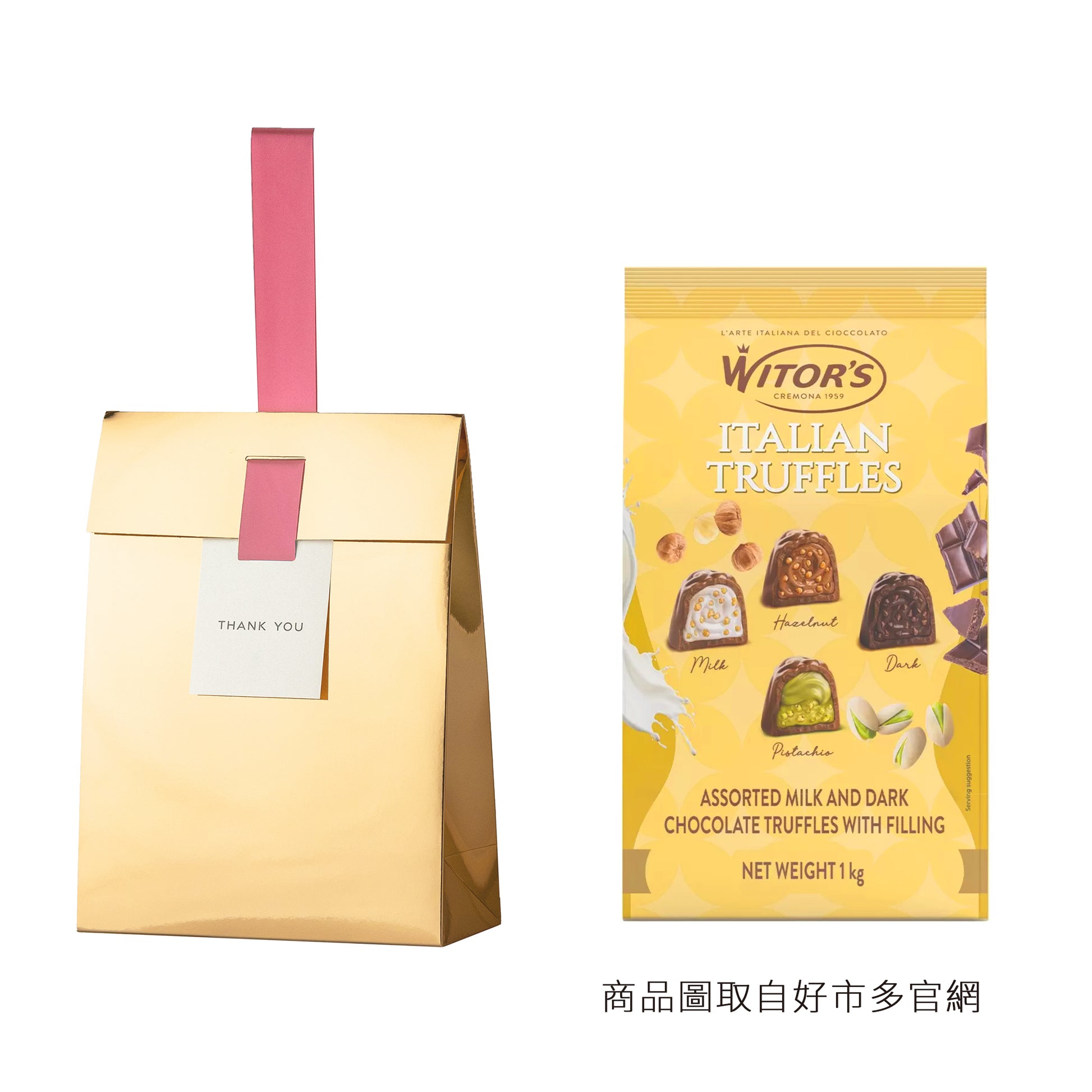 金色禮袋裝上Witor's松露巧克力,開袋即是派對,獨立包裝好分享。小卡穿過緞帶,一件即可客製,寫上頒獎資訊與送收禮姓名。最適合團隊表揚、生日派對、萬聖節Dress Queen、專案達標的輕鬆頒獎時刻。